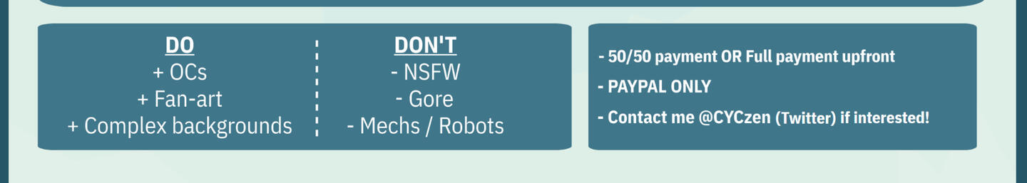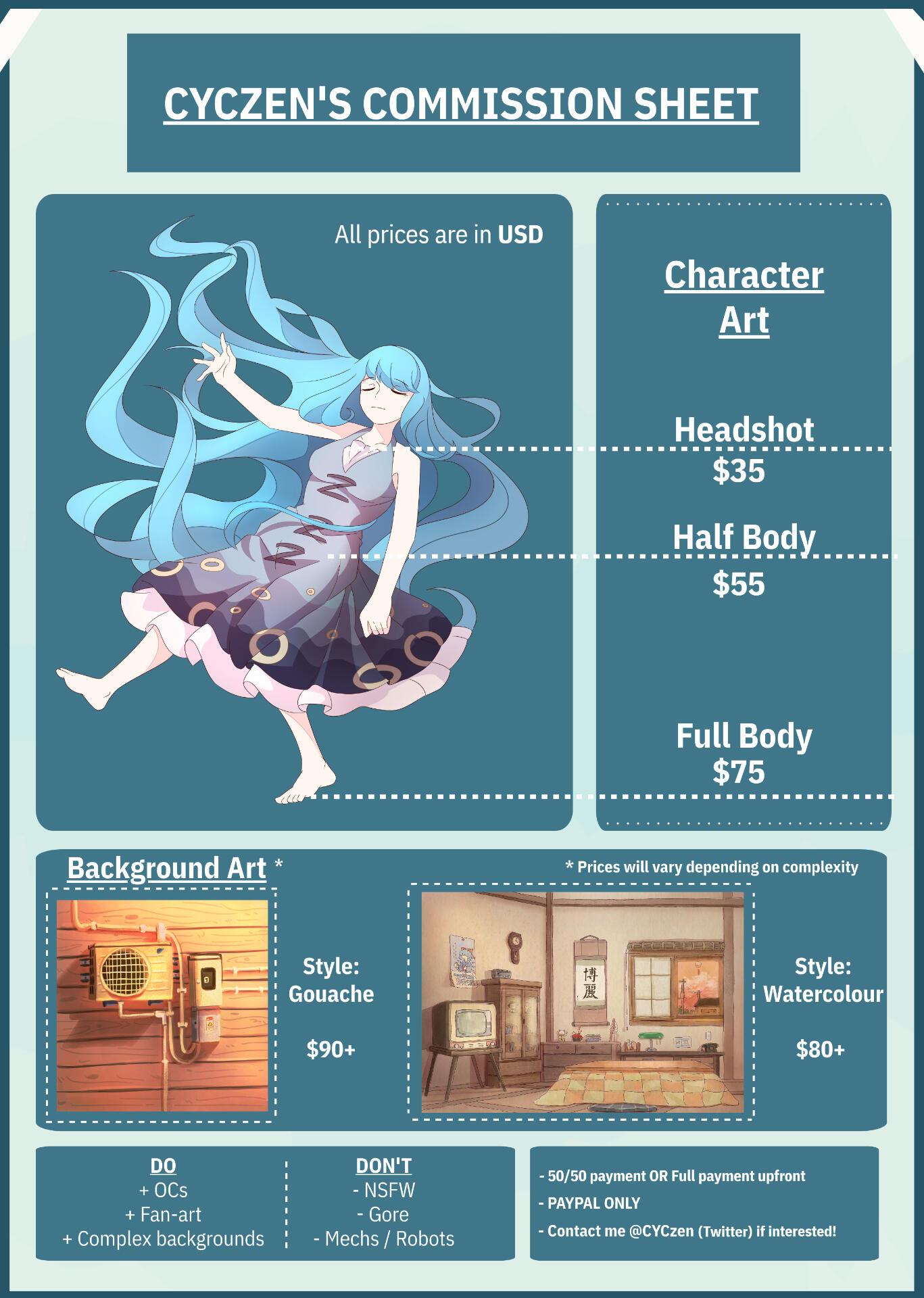 1) Full Payment must be made before sketch.2) Payment must be in USD currency.3) The commission will be cancelled if not paid within 1 week of sketch approval.4) A maximum of **1 major revisions **can be requested upon the sketch. Additional surcharges will be imposed thereafter.5) Clients may give a deadline but it must be at least 1 week from the date of confirmation.6) Clients reserve the right to upload the commissioned art anywhere provided that credit is given.7) Prices displayed are for personal uses only. Commercial work may be subjected to a different fee structure.8) Visual references preferred to negate miscommunication. Images from Dress-Up and Character Maker games work (1-2 references preferably).9) The artist reserves the right to upload commissioned art to social media unless requested to be private prior to artwork completion.